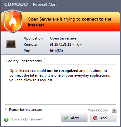 Я начинающий веб-девелопер. До это в основном разрабатывал приложения для корпоративных БД. Сейчас выбираю между Denver, WAMP и OpenServer. Вопрос такой. При запуске C:\OpenServer\Open Server.exe программа пытается приконектиться по адресу 91.197.131.11:80. Если заблокировать, то OpenServer 5.0 не запускается.