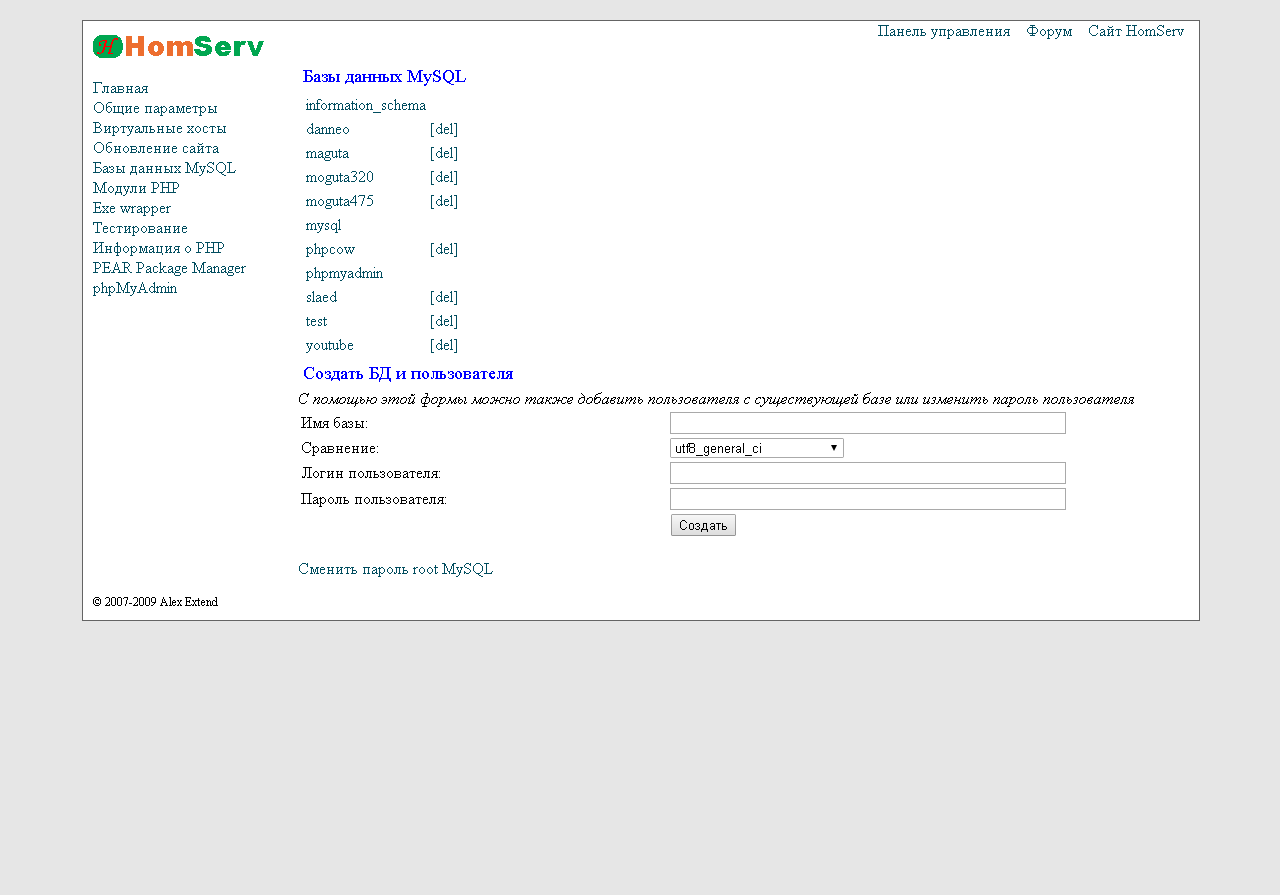 как на HomServ , а-то не удобно из phpMyAdmin создавать новичкам.Скрин прилагаю