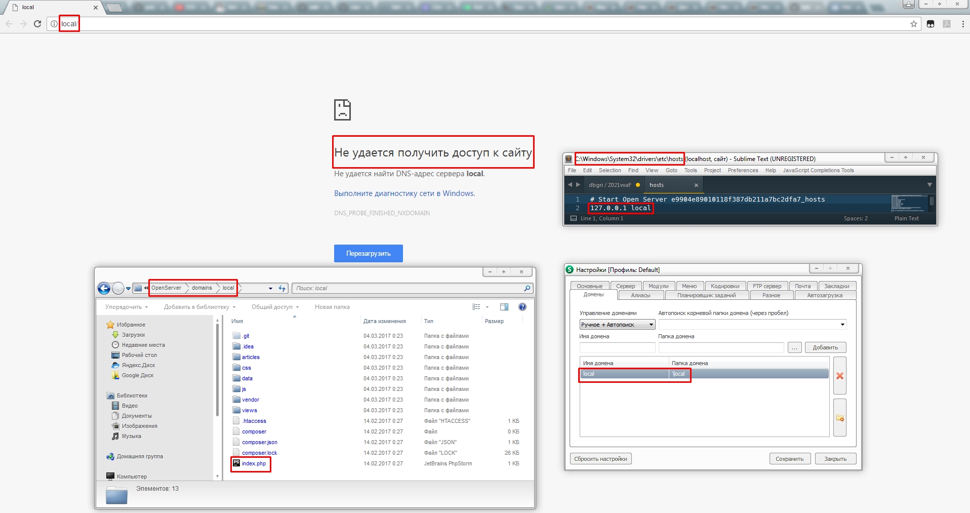Да, вопрос много раз подымался, обсуждался и вроде даже в доках описан. Однако на протяжении длительного времени не могу настроить возможность не прописывать каждый раз в адресной строке "localhost", а сделать разные домены для разных сайтов. На скрине ниже моя свежая попытка реализовать эту "магию". Вопрос один: что я делаю не так?