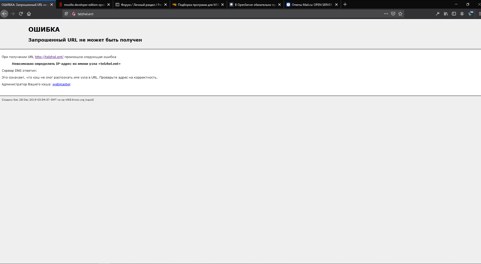 Здравствуйте. Столкнулся с проблемой при попытке работать в openserver через браузер Firefox Developer Edition. В других браузерах (Edge, Chrome, Mozilla Firefox) локальные сайты открываются нормально, а через этот всё время выдаётся сообщение "Запрошенный URL не может быть получен" (скриншот во вложении). В чём может быть проблема?