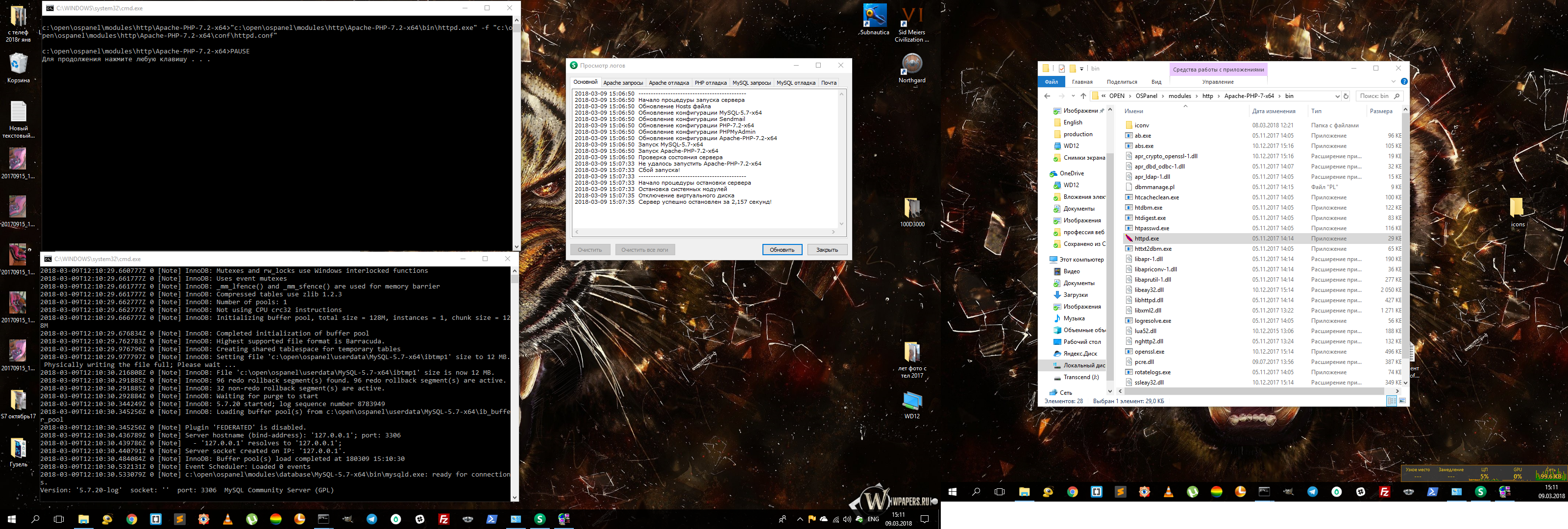 [main] start=30 allow=1 autowait=0 emformat=txt maxmemcache=64 cgiprocess=6 pginitencode=UTF8 pginitlocale=Russian_Russia.1251 ip=127.0.0.1 http_log=1 mysql_log=0 postgresql_log=0 mongodb_log=0 dns_log=0 memcache_log=0 redis_log=0 debugmail=0 mysqlcharset=utf8_general_ci phpdriver="PHP-5.5" httpdriver="Apache-2.4" mysql_driver="MySQL-5.6" pg_driver=none mongo_driver=none memcachedriver=none redisdriver=none dnsdriver=none httpcharset=notset logreadsize=256 showversion=0 astart=0 crdisk=1 crpath=0 crdomain=2 showfvr=0 showprogs=1 hdomains=0 balloon=0 favorite=0 showswitch=1 debugmode=0 stext=1 sbrowser=1 email=0 vdisk=W selfhosts=0 webdir="domains" browser="%realprogdir%\progs\_Internet\GoogleChromePortable\GoogleChromePortable.exe" textred="%realprogdir%\progs\_Office\Notepad++\notepad++.exe" filebrowser="" sfilebrowser=0 maxrequests=0 folders="" [ports] mysqlport=3306 postgresqlport=5432 mongodbport=27017 httpport=80 httpsport=443 httpbackport=8080 ftpport=21 sftpport=990 phpport=9000 redisport=6379 memcacheport=11211 [ftp] ftp=0 ftpcommandtimeout=600 ftpconnecttimeout=60 [sendmail] smtp_server="" smtp_port="" auth_username="" auth_password="" smtp_ssl=0 pop3_server="" pop3_username="" pop3_password="" force_sender=""Содержимое файла main.log:
