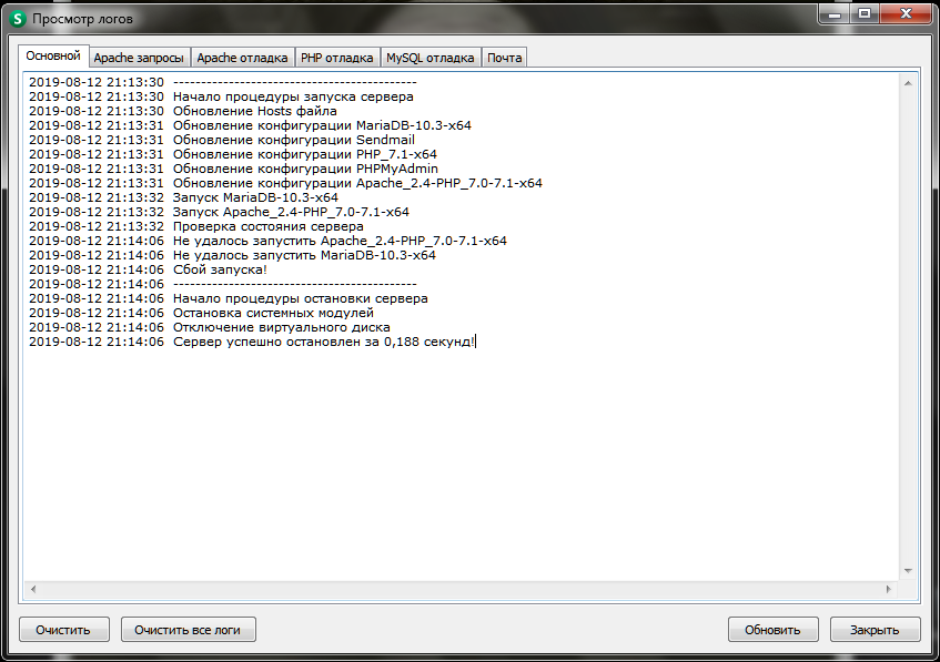 2019-07-05 19:16:34 Сервер успешно остановлен за 0.984 секунд!