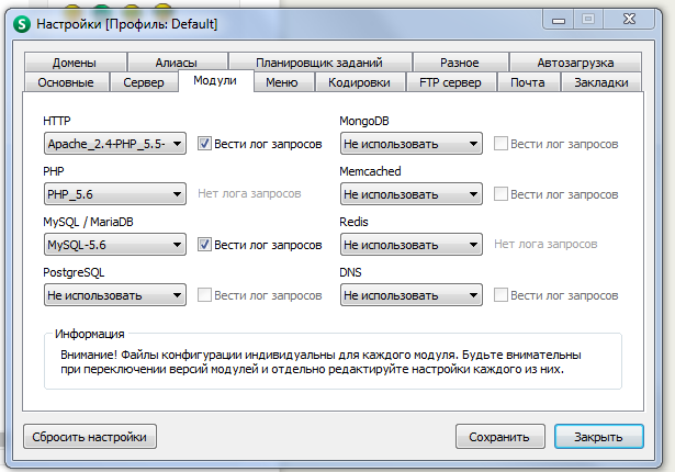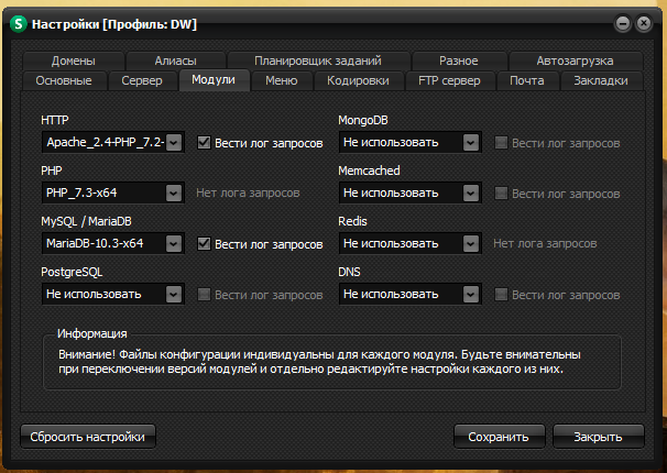zloyuser писал(а): ↑28 сен 2019, 23:49Тоже столкнулся с такой же проблемой. Решилась так. В настройках, вкладка "Модули" просто убери версии Apache, PHP, MariaDB , которые по умолчанию установлены х64 , и поставь те, которые подходят тебе, но только для своей 32битной Windows (не х64). Я для своих нужд установил такие, как на прикреплённом скрине. И всё заработало. Просто разрабы изначально установили при страте сервера в настройках запуск для систем х64, вот и приходиться догадываться в чём может быть проблема самому )) А если сервер будет ругаться на занятый порт 80, то в настройках сервера пропиши порт 81, чтоб не лазить по компу и не искать, что у тебя на 80 порту сидит.Nada писал(а): ↑28 сен 2019, 11:01 Здравствуйте, не запускается .