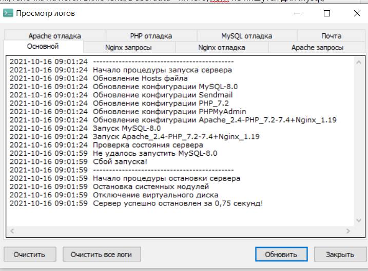 2021-10-14 13:51:30 -------------------------------------------- 2021-10-14 13:51:30 Начало процедуры запуска сервера 2021-10-14 13:51:31 Обновление Hosts файла 2021-10-14 13:51:31 Обновление конфигурации MySQL-5.7 2021-10-14 13:51:31 Обновление конфигурации Sendmail 2021-10-14 13:51:31 Обновление конфигурации PHP_7.4 2021-10-14 13:51:31 Обновление конфигурации PHPMyAdmin 2021-10-14 13:51:31 Обновление конфигурации Apache_2.4-PHP_7.2-7.4 2021-10-14 13:51:31 Запуск MySQL-5.7 2021-10-14 13:51:31 Запуск Apache_2.4-PHP_7.2-7.4 2021-10-14 13:51:31 Проверка состояния сервера 2021-10-14 13:51:59 Не удалось запустить Apache_2.4-PHP_7.2-7.4 2021-10-14 13:51:59 Не удалось запустить MySQL-5.7 2021-10-14 13:51:59 Сбой запуска! 2021-10-14 13:51:59 -------------------------------------------- 2021-10-14 13:51:59 Начало процедуры остановки сервера 2021-10-14 13:51:59 Остановка системных модулей 2021-10-14 13:52:00 Отключение виртуального диска 2021-10-14 13:52:00 Сервер успешно остановлен за 0,265 секунд!