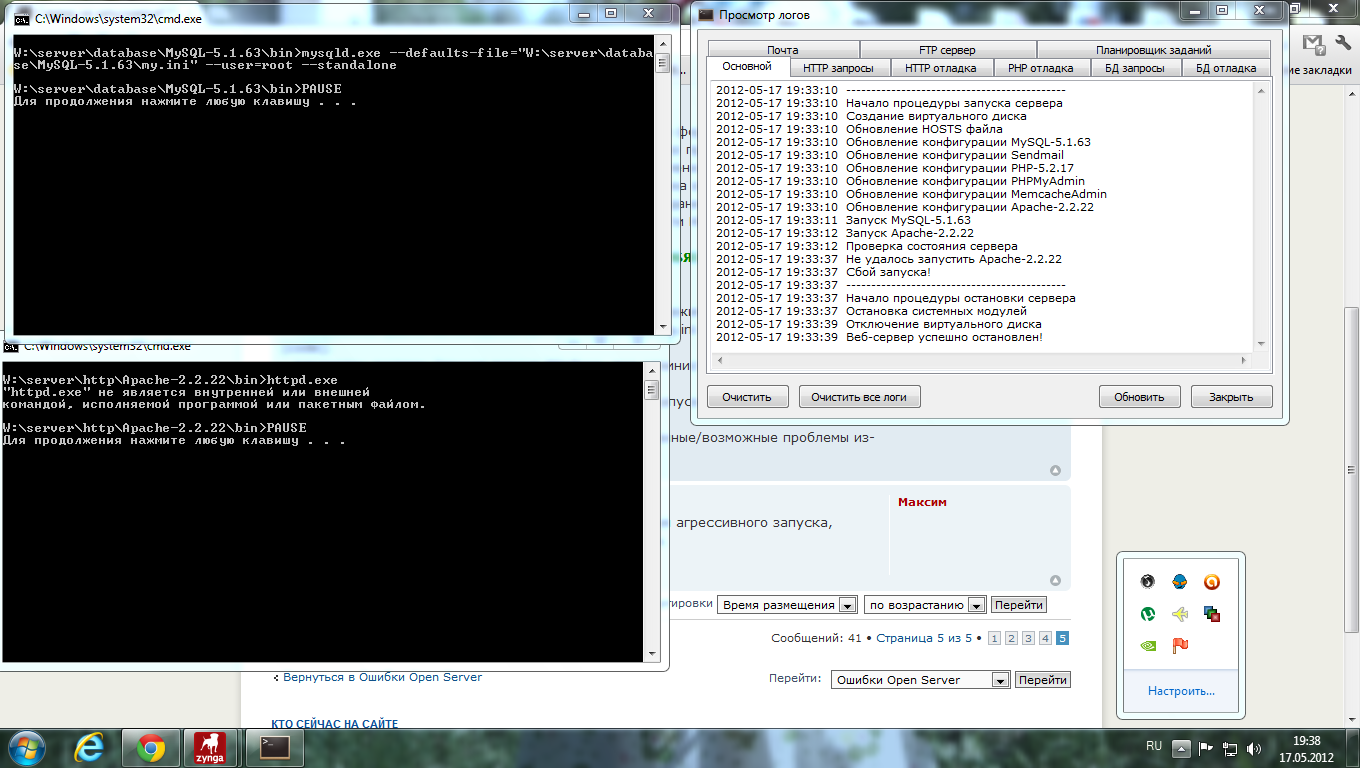 2012-05-21 19:51:07 -------------------------------------------- 2012-05-21 19:51:07 Начало процедуры запуска сервера 2012-05-21 19:51:07 Обновление HOSTS файла 2012-05-21 19:51:07 Обновление конфигурации MySQL-5.1.63 2012-05-21 19:51:07 Обновление конфигурации Sendmail 2012-05-21 19:51:07 Обновление конфигурации PHP-5.2.17 2012-05-21 19:51:08 Обновление конфигурации PHPMyAdmin 2012-05-21 19:51:08 Обновление конфигурации MemcacheAdmin 2012-05-21 19:51:08 Обновление конфигурации Apache-2.2.22 2012-05-21 19:51:09 Запуск MySQL-5.1.63 2012-05-21 19:51:13 Запуск Apache-2.2.22 2012-05-21 19:51:14 Проверка состояния сервера 2012-05-21 19:51:31 Не удалось запустить Apache-2.2.22 2012-05-21 19:51:31 Сбой запуска! 2012-05-21 19:51:31 -------------------------------------------- 2012-05-21 19:51:31 Начало процедуры остановки сервера 2012-05-21 19:51:31 Остановка системных модулейHTTP отладка