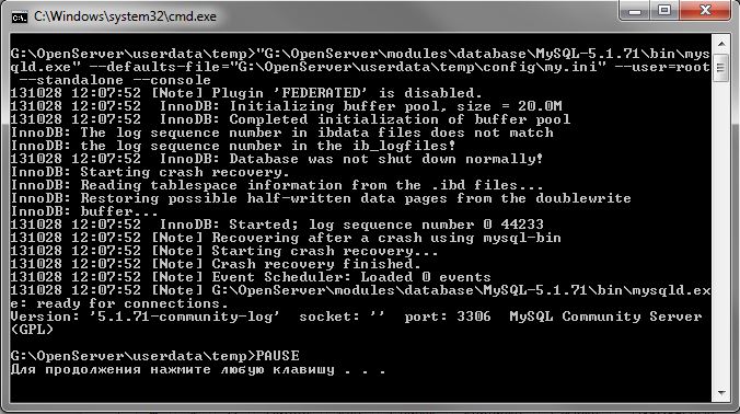 131028 12:23:40 [Note] Plugin 'FEDERATED' is disabled. 131028 12:23:40 InnoDB: Initializing buffer pool, size = 20.0M 131028 12:23:40 InnoDB: Completed initialization of buffer pool InnoDB: The log sequence number in ibdata files does not match InnoDB: the log sequence number in the ib_logfiles! 131028 12:23:40 InnoDB: Database was not shut down normally! InnoDB: Starting crash recovery. InnoDB: Reading tablespace information from the .ibd files... InnoDB: Restoring possible half-written data pages from the doublewrite InnoDB: buffer... 131028 12:23:41 InnoDB: Started; log sequence number 0 44233 131028 12:23:41 [Note] Recovering after a crash using mysql-bin 131028 12:23:41 [Note] Starting crash recovery... 131028 12:23:41 [Note] Crash recovery finished. 131028 12:23:41 [Note] Event Scheduler: Loaded 0 events 131028 12:23:41 [Note] G:\OpenServer\modules\database\MySQL-5.1.71\bin\mysqld.exe: ready for connections. Version: '5.1.71-community-log' socket: '' port: 3306 MySQL Community Server (GPL)Почта: пусто