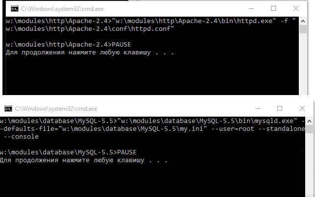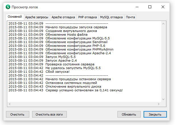 2015-08-11 03:04:09 -------------------------------------------- 2015-08-11 03:04:09 Начало процедуры запуска сервера 2015-08-11 03:04:09 Создание виртуального диска 2015-08-11 03:04:09 Обновление Hosts файла 2015-08-11 03:04:09 Обновление конфигурации MySQL-5.5 2015-08-11 03:04:09 Обновление конфигурации Sendmail 2015-08-11 03:04:09 Обновление конфигурации PHP-5.6 2015-08-11 03:04:09 Обновление конфигурации PHPMyAdmin 2015-08-11 03:04:09 Обновление конфигурации Apache-2.4 2015-08-11 03:04:09 Запуск MySQL-5.5 2015-08-11 03:04:09 Запуск Apache-2.4 2015-08-11 03:04:09 Проверка состояния сервера 2015-08-11 03:04:42 Не удалось запустить MySQL-5.5 2015-08-11 03:04:42 Сбой запуска! 2015-08-11 03:04:42 -------------------------------------------- 2015-08-11 03:04:42 Начало процедуры остановки сервера 2015-08-11 03:04:42 Остановка системных модулей 2015-08-11 03:04:43 Отключение виртуального диска 2015-08-11 03:04:43 Сервер успешно остановлен за 0,141 секунд!Apache запросы - пусто, ничего не пишет.