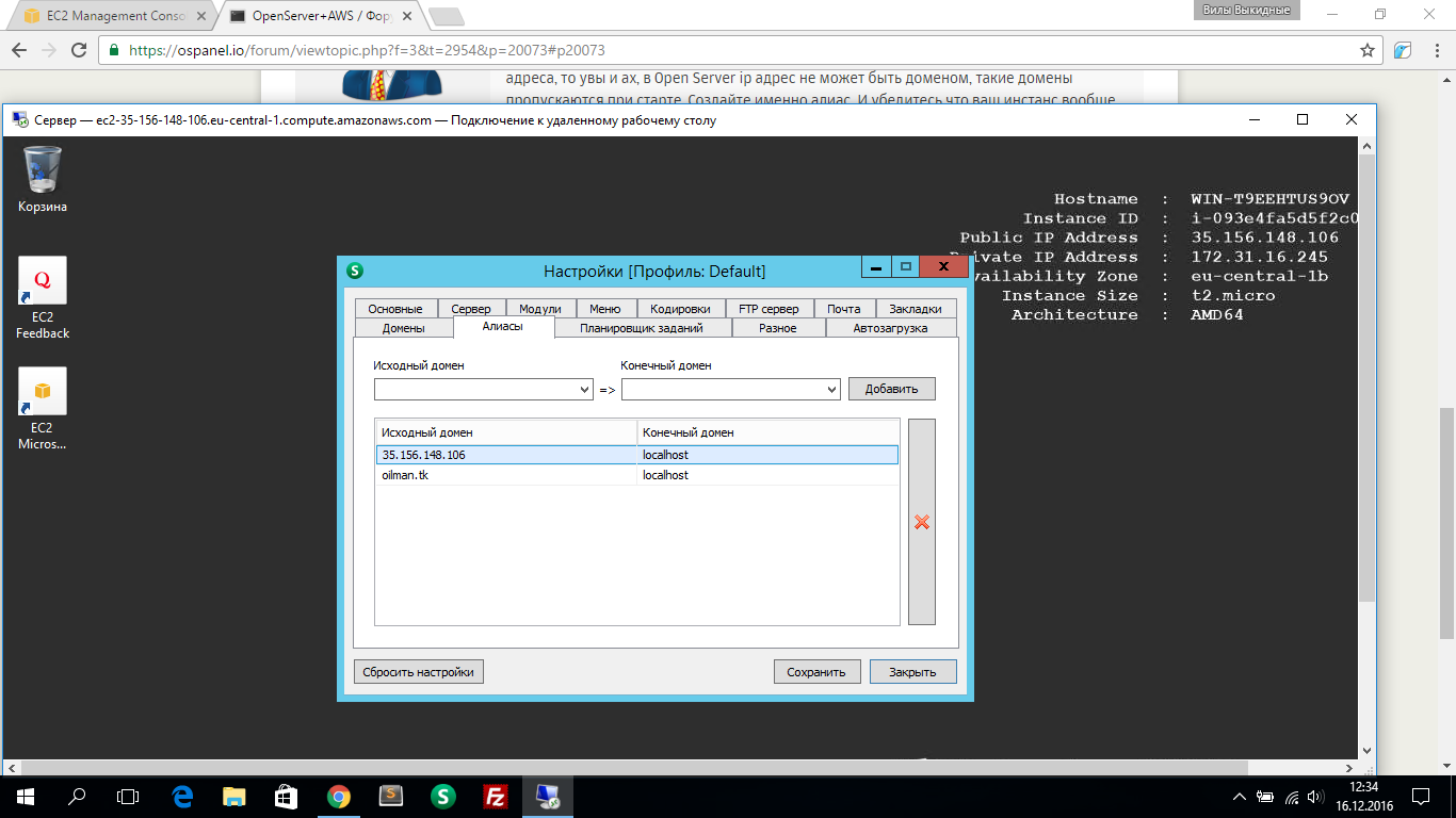 Домен привязан к Elastic IP (публичный) сервера по A записи