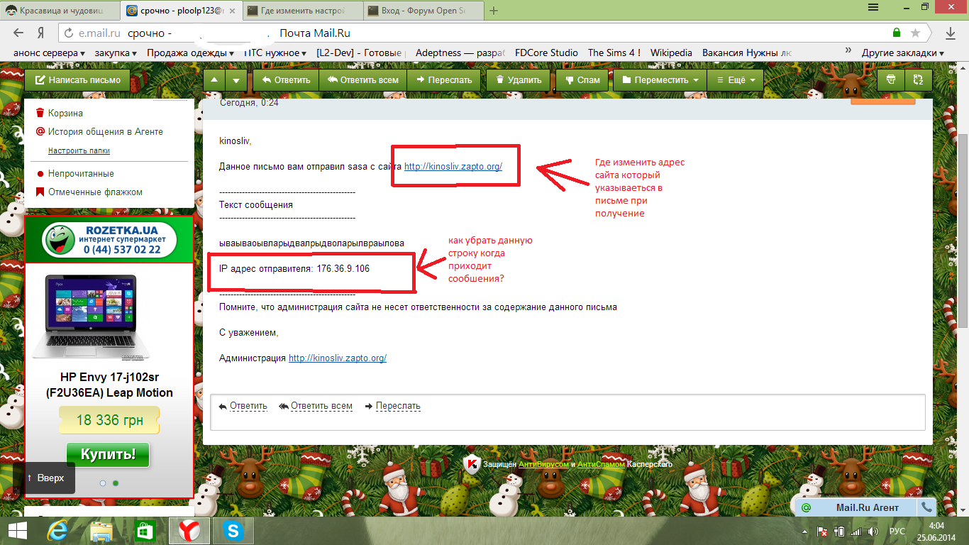То у меня в письме приходит ссылка не на тот сайт который у меня стоит и еще в письме указывается мой ип (ип от куда пришло письмо). Подскажите плс как поправить и где.