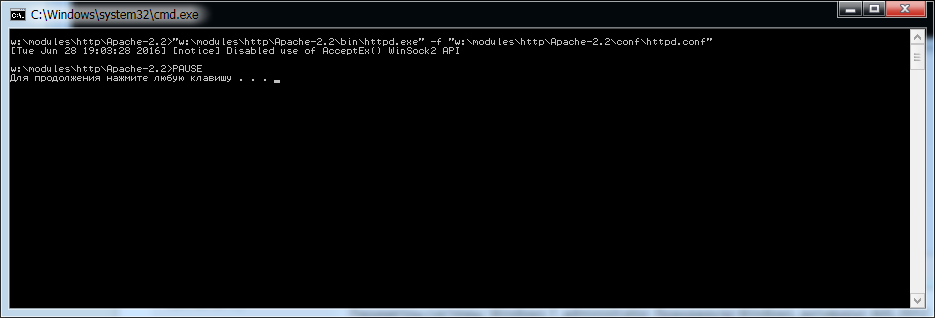 [Tue Jun 28 19:03:29 2016] [warn] Init: Name-based SSL virtual hosts only work for clients with TLS server name indication support (RFC 4366) [Tue Jun 28 19:03:31 2016] [warn] Init: Name-based SSL virtual hosts only work for clients with TLS server name indication support (RFC 4366) [Tue Jun 28 19:03:31 2016] [notice] Apache/2.2.31 (Win32) mod_ssl/2.2.31 OpenSSL/1.0.1p configured -- resuming normal operations [Tue Jun 28 19:03:31 2016] [notice] Server built: Jul 16 2015 11:30:50 [Tue Jun 28 19:03:31 2016] [notice] Parent: Created child process 2356 [Tue Jun 28 19:03:31 2016] [notice] Disabled use of AcceptEx() WinSock2 API [Tue Jun 28 19:03:32 2016] [warn] Init: Name-based SSL virtual hosts only work for clients with TLS server name indication support (RFC 4366) [Tue Jun 28 19:03:34 2016] [warn] Init: Name-based SSL virtual hosts only work for clients with TLS server name indication support (RFC 4366) [Tue Jun 28 19:03:34 2016] [notice] Child 2356: Child process is running [Tue Jun 28 19:03:34 2016] [notice] Child 2356: Acquired the start mutex. [Tue Jun 28 19:03:34 2016] [notice] Child 2356: Starting 32 worker threads. [Tue Jun 28 19:03:34 2016] [notice] Child 2356: Listening on port 443. [Tue Jun 28 19:03:34 2016] [notice] Child 2356: Listening on port 80.Остальные логи пустые.
