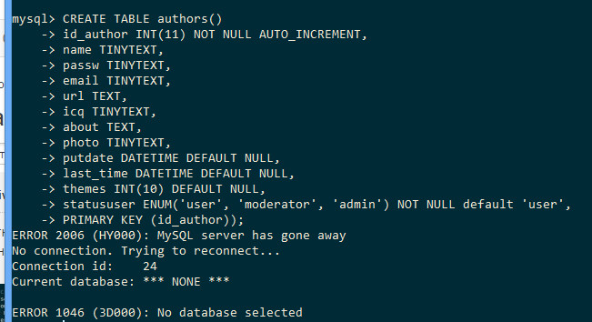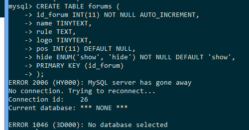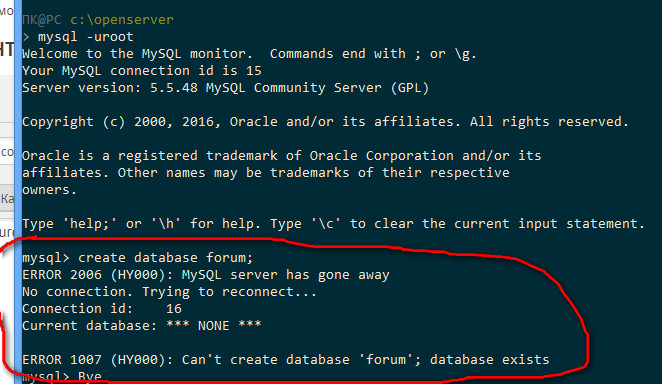 Я открыл консоль, ввёл mysql -uroot, потом ввожу create database forum