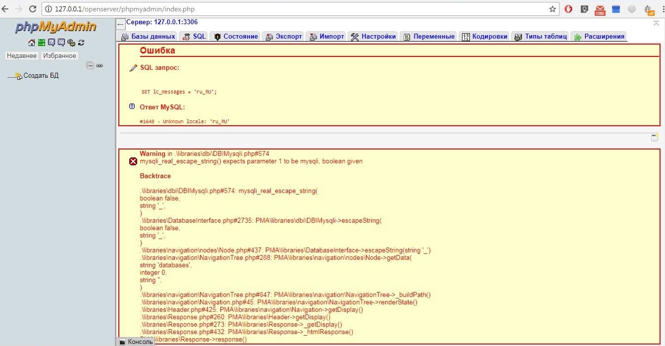 Добрый день. Ничего не могу создать или удалить в phpmyadmin. Уже переустанавливал openserver ошибка не пропала. В какую сторону копать? Спасибо
