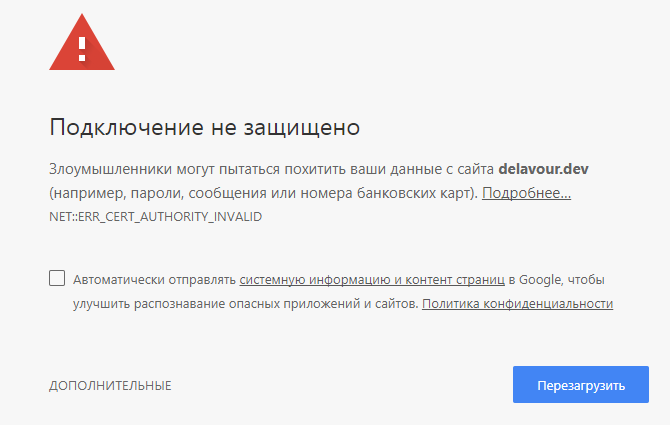 Сегодня обнаружил, что не могу зайти ни на один из моих сайтов, работающих через OS в хроме. В строке адреса http почему-то заменяется на https и страница выглядит так, как показано на скриншоте. Хром не пускает на сайт. Я не использую https, и еще вчера все работало. Вероятно это связано с обновлением хрома до версии 63, но я не уверен, обновления происходят в фоне, и последний раз когда я проверял версию, а это было около месяца назад, то версия была еще 62.