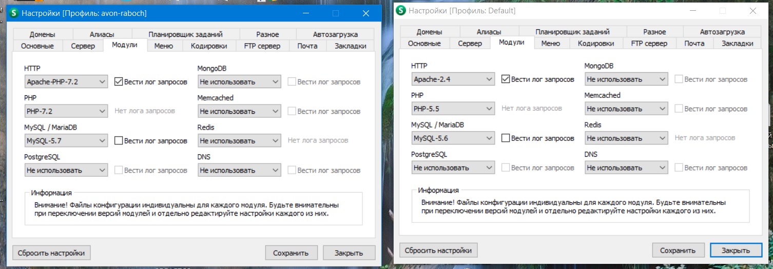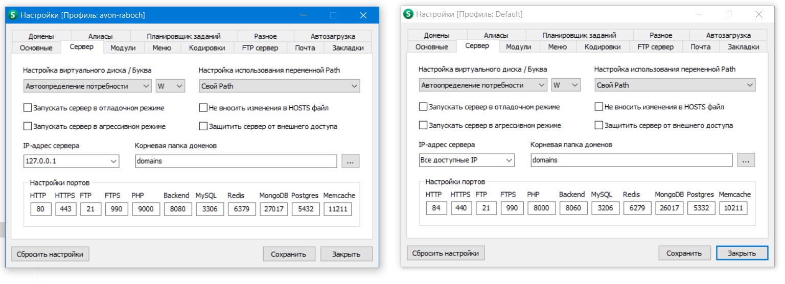 Включил по очереди оба сервера расположенных на разных дисках, но не запустил, а сразу открыл настройки. Настроил разные IP, один по умолчанию 127.0.0.1, а другой "Все доступные IP" - это что бы не были на одном IP. Пытался изменить IP на числовые, что выпадают из списка, но каждый раз при запуске серверов - один запустился - второй выдал ошибку запуска.