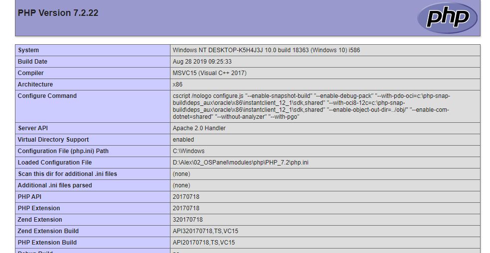 настройки php-info() которые выдает мне openserver: