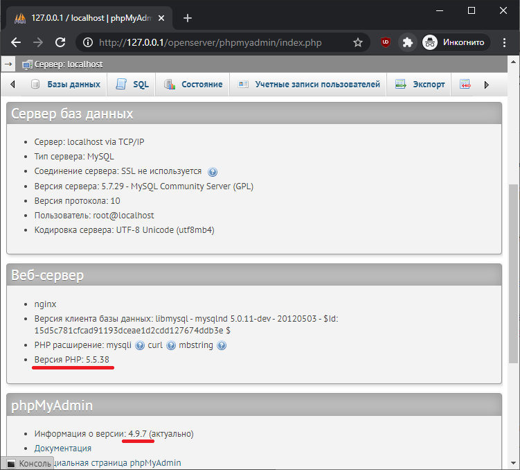 пробовал по всякому заходил в этот common.inc.php изменял версию появлялся третий болт при в ходе в PhpMyAdmin пробовал выставлять настройки к примеру PHP 5.6, mysol 5,6, и Атачь 5.6 сохронял перезагружал и все-ровно тот-же болт, ставил галочки на логи убирал а болт всеровно тот-же при входе в phpmyadmin, может кто подскажет какой выход как убрать эту ошибку? я думаю может из за того что я установил на Д диск, может из за этого? или может снисти этот опен сервер и установить версию старей то есть скачать с торента старей версию? какой выход кто подскажет?