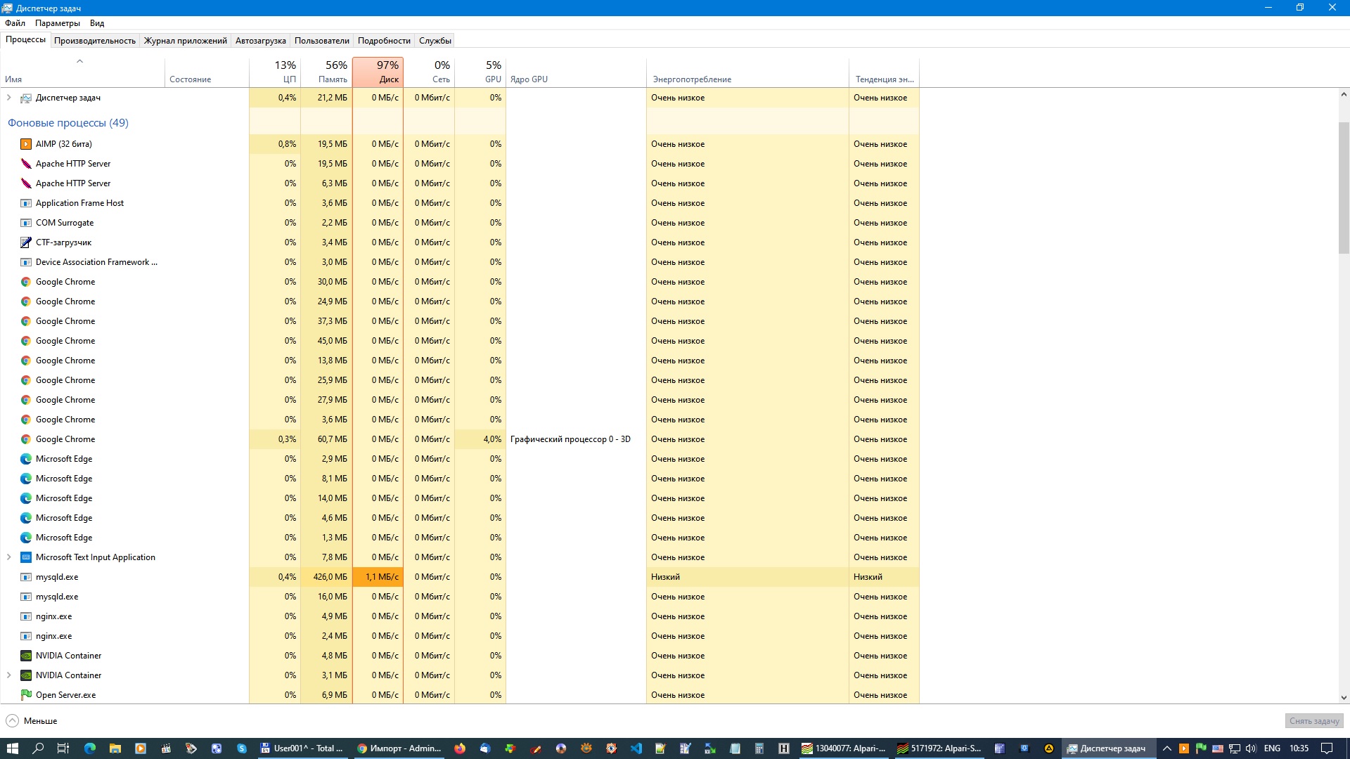 Версия 5.4.0 при попытке восстановить базу размером 557 Кб очень долго висит, и потом выдает ошибку 540, база сделана в том же PhpMyAdmin, в той же конфигурации. Через PhpMyAdmin или Adminer без разницы, сначала подвисание, потом ошибка 540. И при запуске процесса mysqld.exe в диспетчере задач загрузка диска 97-100%.