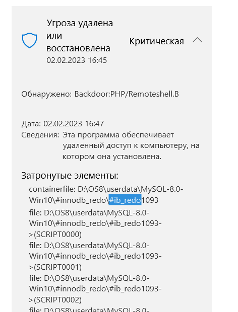 При импорте базы данных, Microsoft Defender выявил вирус и поместил файл ib_redo в карантин, далее при попытки восстановить, файл был удалён.