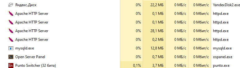 При запуске сервера (1 сайт там) httpd.exe (2 шт. этих процессов запускается где то 10 Мб всего памяти занимают)