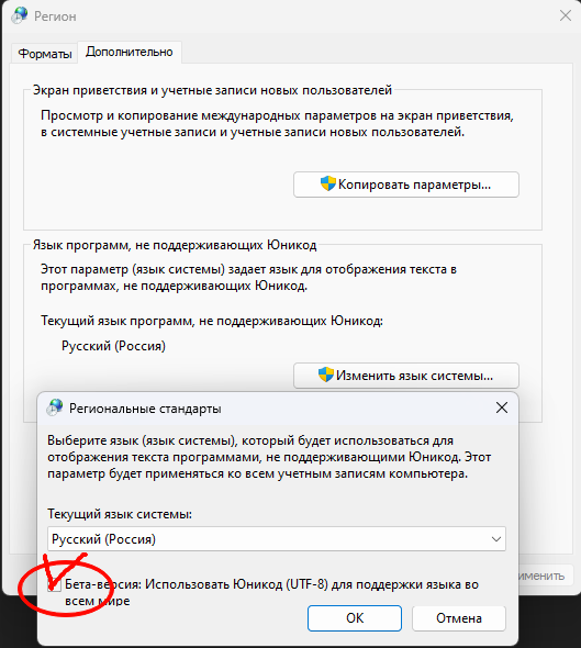 Переходим на вкладку "Дополнительно", внизу нажимаем кнопку "Изменить язык системы", в следующем окошке ставим галочку режима "Бета-версия: Использовать (UTF-8)".