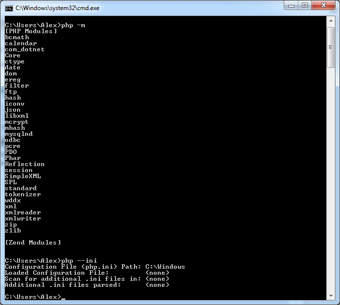 Почему то при работе через консоль не показывается все подключенные модули. И почему то указывает путь на папку C:\Windows . Вот например мне нужный модуль pdo_mysql а его не хочет находить.