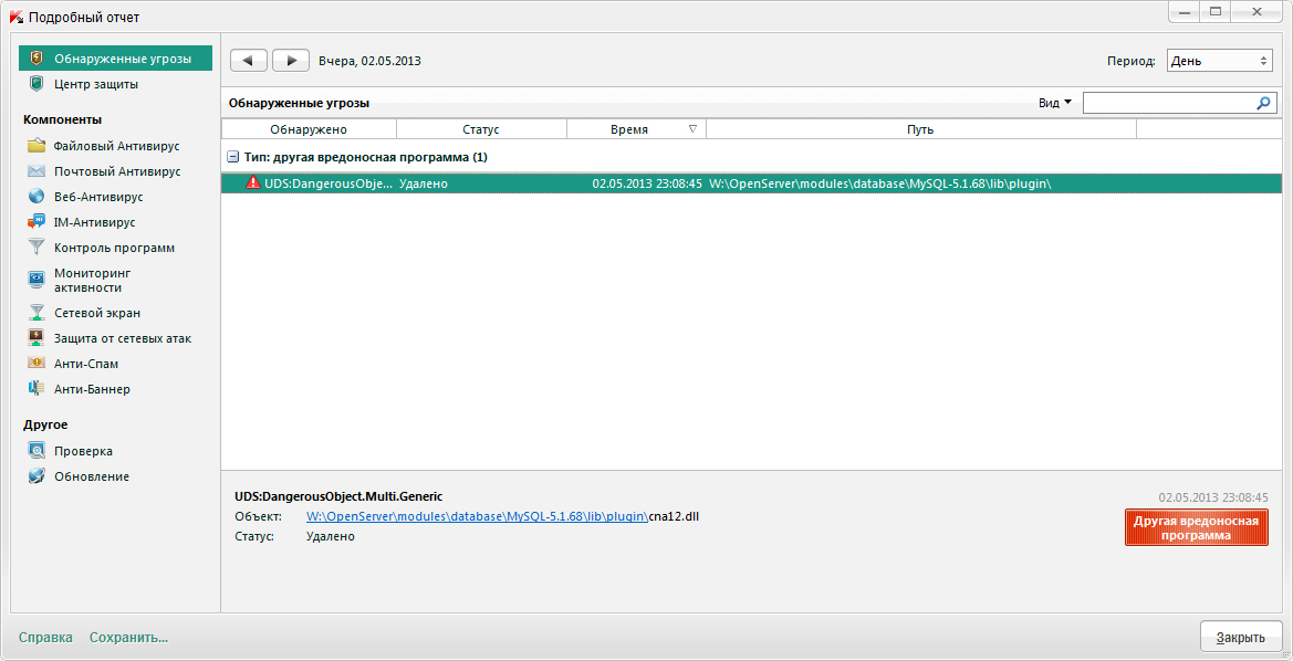 Активно пользуюсь OpenServer уже около месяца,недели три назад Kaspersky(KIS13) начал ругаться на файл(скриншот прилагается).