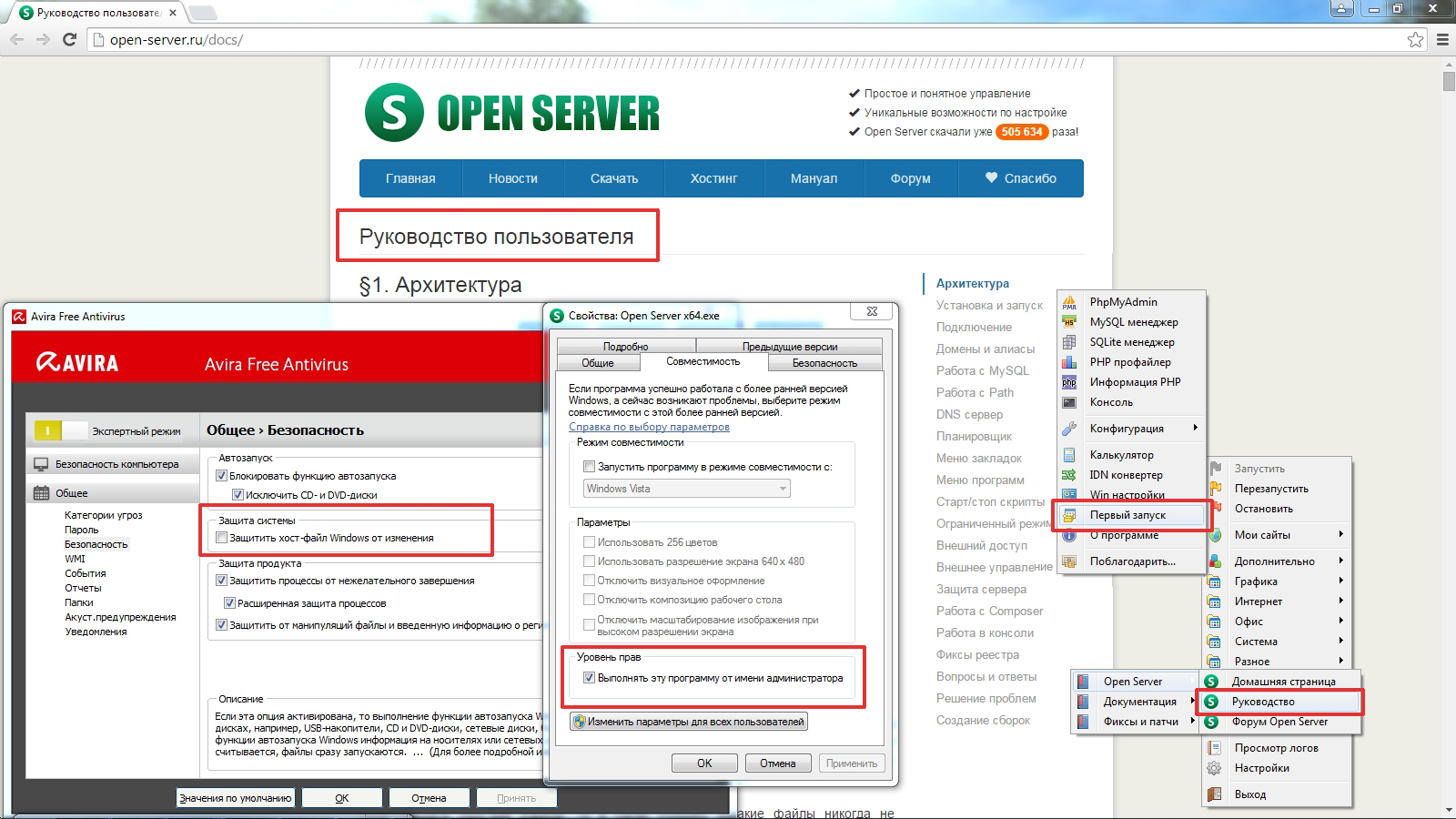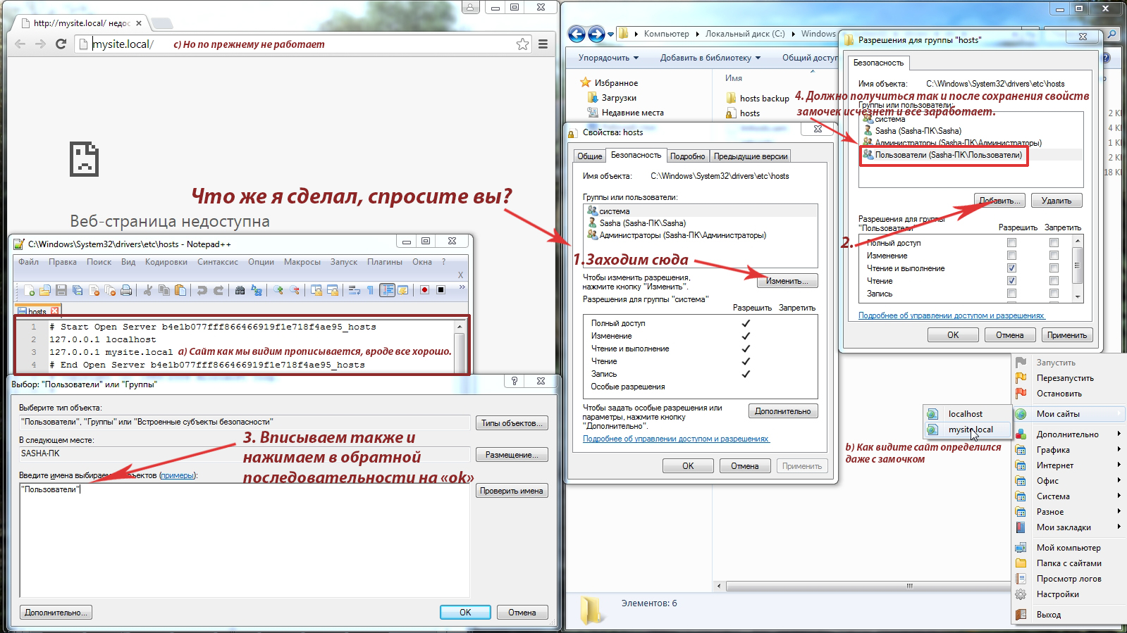 Максим, все было сделано по пунктикам, если вы про все что отмечено красным, то все было сделано. Как я писал выше Open Server прекрасно прописывал все в файле hosts даже с замочком, сайт определялся им в Open Server в пункте "Мои сайты", но сайт не открывался из-за этого замка, уж не знаю как он влияет, но он заставил меня потратить пол дня, и сбил с толку, я считаю что про эту мелочь нужно написать в руководстве пользователя, дабы люди не ломали головы и не закидывали вас вопросами.