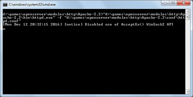 2016-12-12 20:32:14 -------------------------------------------- 2016-12-12 20:32:14 Начало процедуры запуска сервера 2016-12-12 20:32:14 Обновление Hosts файла 2016-12-12 20:32:14 Обновление конфигурации MySQL-5.5 2016-12-12 20:32:14 Обновление конфигурации Sendmail 2016-12-12 20:32:14 Обновление конфигурации PHP-5.4 2016-12-12 20:32:14 Обновление конфигурации PHPMyAdmin 2016-12-12 20:32:14 Обновление конфигурации Apache-2.2 2016-12-12 20:32:14 Запуск MySQL-5.5 2016-12-12 20:32:14 Запуск Apache-2.2 2016-12-12 20:32:14 Проверка состояния сервера 2016-12-12 20:32:47 Не удалось запустить MySQL-5.5 2016-12-12 20:32:47 Сбой запуска! 2016-12-12 20:32:47 -------------------------------------------- 2016-12-12 20:32:47 Начало процедуры остановки сервера 2016-12-12 20:32:47 Остановка системных модулей 2016-12-12 20:32:48 Отключение виртуального диска 2016-12-12 20:32:48 Сервер успешно остановлен за 0,187 секунд!Apache отладка: