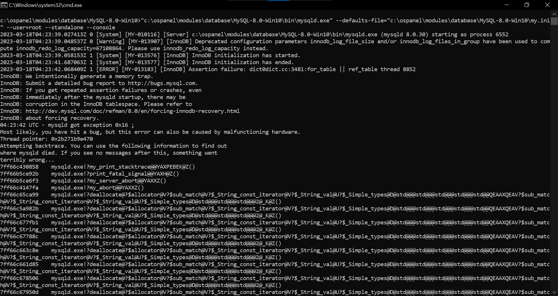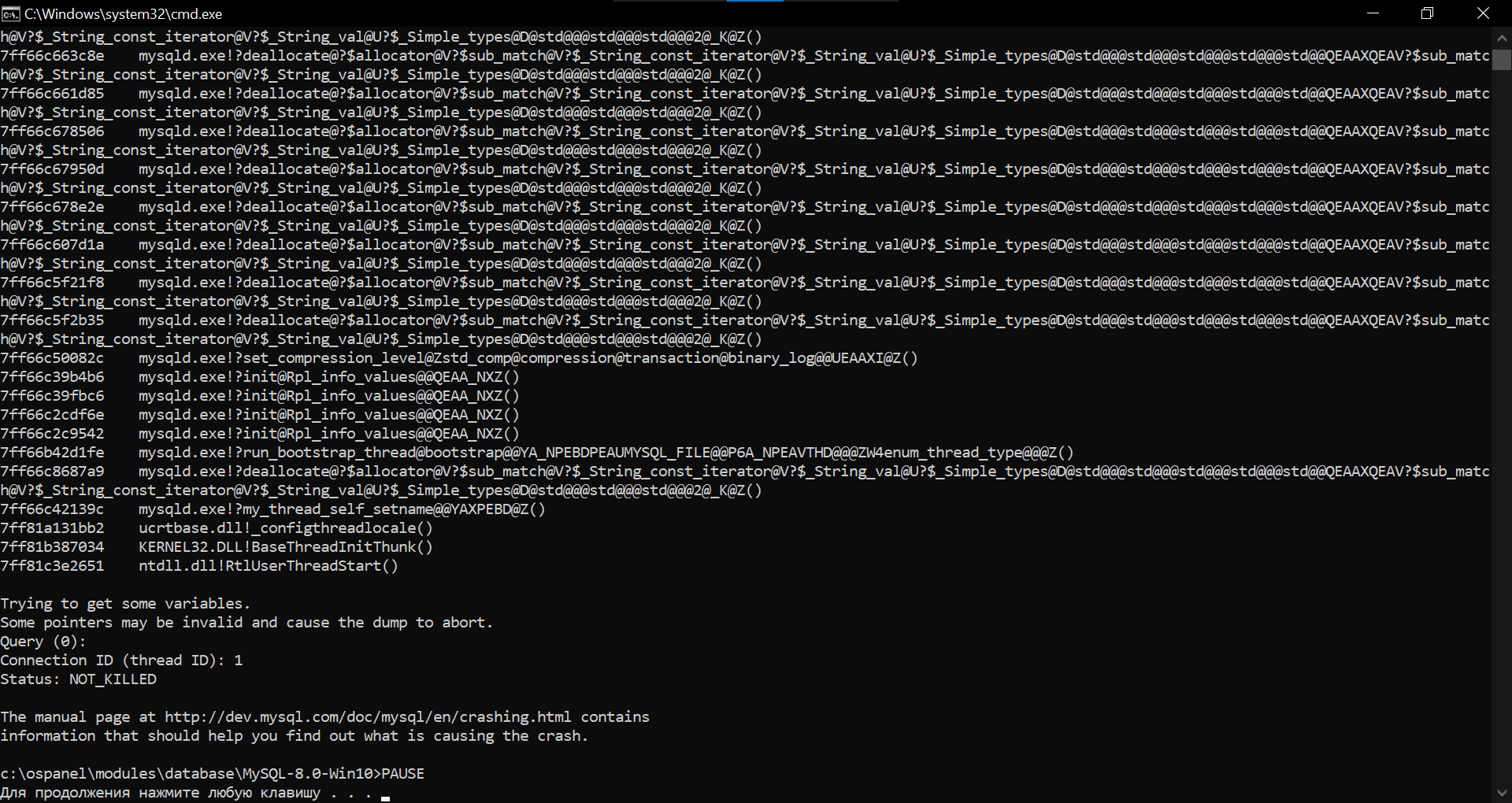 Проблему решил перешел по пути: C:\OSPanel\userdata\MySQL-8.0-Win10 и удалил файлы undo_001 и undo_002. Буду благодарен, если кто объяснить почему возникла проблема такая и причем тут удаленные файлы!