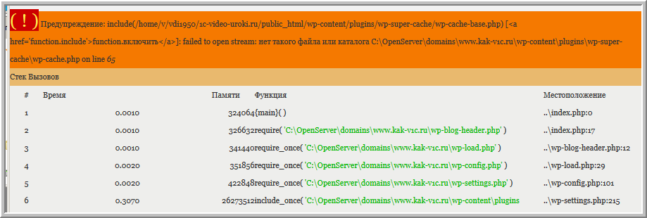 Сайт на wordpress перенесен хостинга на open-server. Сайт, вроде-бы, благополучно открывается. Однако перед содержимым сайта отображаются несколько ошибок.