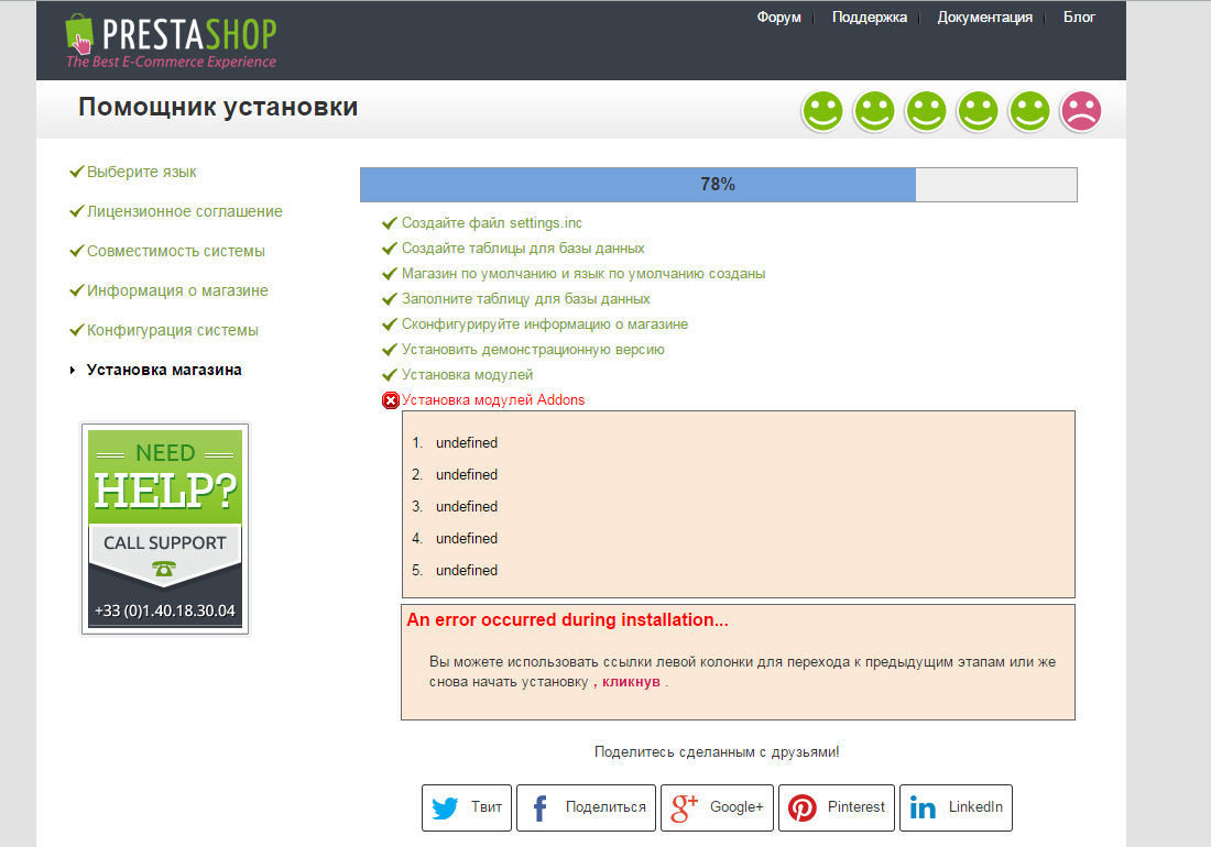 Попытался установить Prestashop 1.0.6.9 (другие версии не интересуют) выдает ошибку на последнем шаге "Установка модулей"... ((