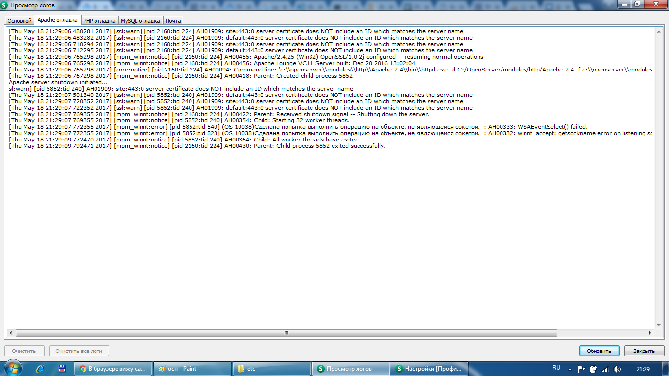 Покопался в логах и увидел ошибки. Скриншоты логов внизу.