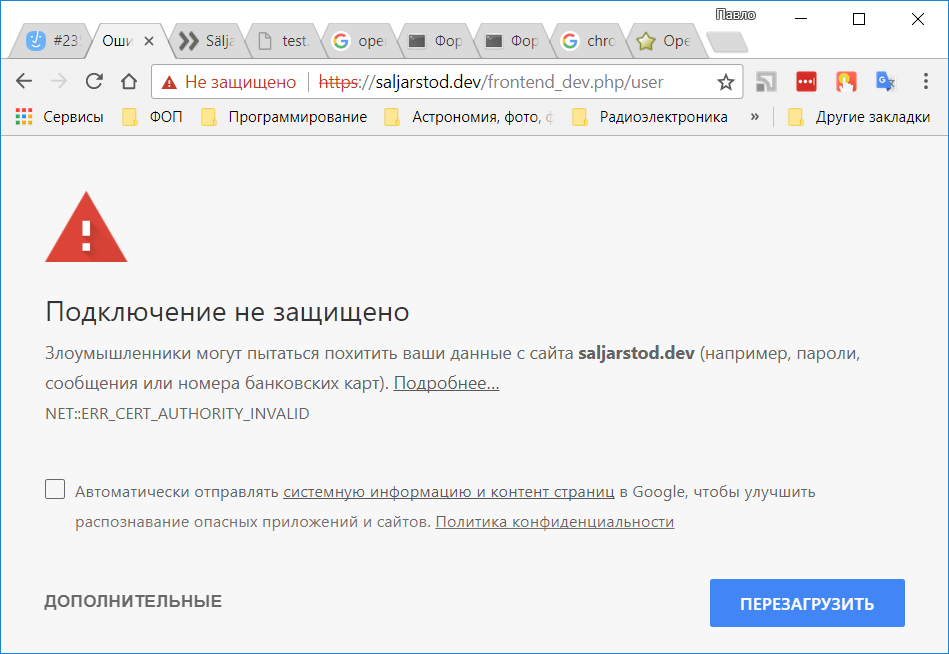 Сегодня обнаружил, что не могу зайти ни на один из моих сайтов, работающих через OS в хроме. В строке адреса http почему-то заменяется на https и страница выглядит так, как показано на скриншоте. Хром не пускает на сайт. Я не использую https, и еще вчера все работало. Вероятно это связано с обновлением хрома до версии 63, но я не уверен, обновления происходят в фоне, и последний раз когда я проверял версию, а это было около месяца назад, то версия была еще 62.