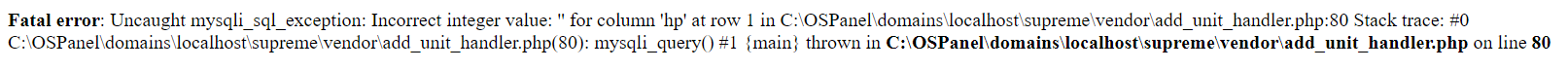 Fatal error: Uncaught mysqli_sql_exception: Incorrect integer value: '' for column 'hp' at row 1 in C:\OSPanel\domains\localhost\supreme\vendor\add_unit_handler.php:80 Stack trace: #0 C:\OSPanel\domains\localhost\supreme\vendor\add_unit_handler.php(80): mysqli_query() #1 {main} thrown in C:\OSPanel\domains\localhost\supreme\vendor\add_unit_handler.php on line 80